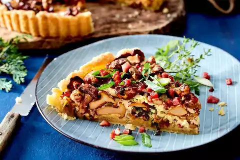 Spread the dough base with breadcrumbs. Spread the mushroom mixture on top and pour the egg icing over it. Bake the tart in a preheated oven (electric cooker: 200 °C/circulating air: 180 °C/gas: see manufacturer) for approx. 40 minutes.