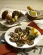 Remove meat from the pan and keep warm. Sauté onion and garlic in the frying fat. Add chanterelles and sauté while stirring. Deglaze with stock and crème légère and bring to the boil. Thicken with sauce thickener and season to taste with salt and pepper.
