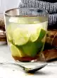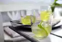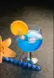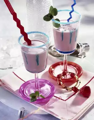Run down the inner edge of the glass. Repeat this procedure several times so that the glass is streaked with several blue stripes. Serve garnished with mint.