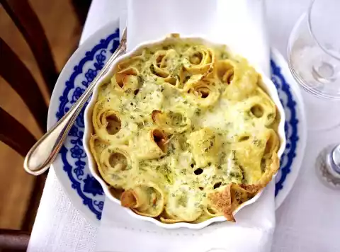 Preheat oven (electric cooker: 175 °C/circulating air: 150 °C/gas: see manufacturer). Place pancake rolls with the cut side down in four small ovenproof, greased moulds or one large mould.