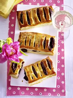 4 Make horizontal cuts in the other rectangles of dough. Place them on the turnovers, welding the edges together. Dilute the egg yolk with a little water (or milk) and brush the turnovers with it. Bake for about 20 minutes