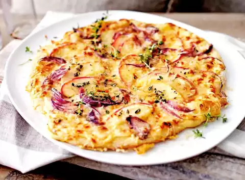 For the topping, stir the crème fraîche until smooth. Season to taste with salt, pepper and sugar. Peel onions and cut into fine slices. Wash, quarter and core the apples. Cut the apple quarters into thin slices.