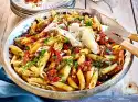 For the pizza dough dissolve fresh yeast and 1⁄2 TL sugar in 140 ml lukewarm water and let it rise for about 10 minutes. Mix 450 g flour and semolina in a bowl. Add yeast water and 150 ml lukewarm water, knead everything with the dough hooks of the mixer.