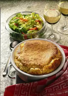 Peel the carrot, grate finely and squeeze it well in a kitchen towel. Grate cheese finely as well. Separate eggs. Heat the fat in a pot and sauté the flour while stirring. Slowly add the milk and heat up while stirring. Gradually stir the egg yolks into the mixture. Then fold cheese and carrots into the dough. Season with pepper and nutmeg. Beat the egg white until stiff and fold loosely into the cheese mixture. Pour the soufflé mixture into a greased mould (approx. 1 litre capacity) and smooth it down. Bake in a preheated oven (electric: 200 °C/ gas: level 3) for approx. 30 minutes. In the meantime, clean and wash the salad and drain well. Pluck the salad leaves into bite-sized pieces. Wash and halve the tomatoes, remove the stalk and cut the tomatoes into slices. Peel and finely chop the onion. Mix vinegar, salt, pepper and onion. Finally, beat in the oil. Arrange the salad in a bowl, add the vinaigrette and sprinkle with chives. Remove cheese and carrot soufflé from the oven and serve. Serve with salad