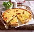 Roll out the dough between 2 layers of baking paper if necessary (approx. 30 cm Ø). Place the dough in a greased, flour-spread tart tin (e.g. with a removable base; 26 cm Ø). Prick the base more often and chill for about 1 hour.