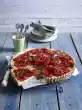 Cut the ciabatta into cubes and roast it in a coated pan without fat until golden brown. Wash and halve the tomatoes. Drain olives and mozzarella. Cut ham slices in half and roll up.