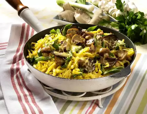 Add spring onions, fry for 2 minutes, put everything aside. Heat another 2 tablespoons of oil in the pan. Fry the spaetzle for 5 minutes. Also season with salt and pepper. Fold in the prepared mushroom mixture and parsley.