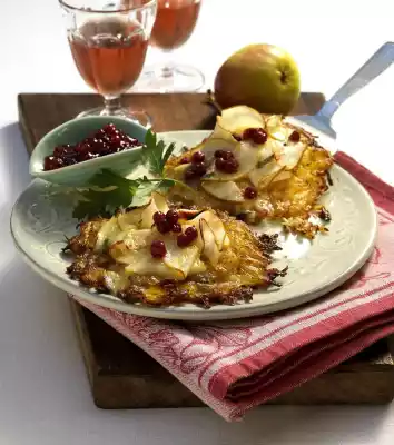 Place the Rösti on a baking tray lined with baking paper. Wash, quarter and core the pears. Cut pear quarters into wafer-thin slices and sprinkle with lemon juice. Spread the pear wedges over the Rösti. Cut cheese into cubes and place on the pears. Bake the Rösti in a preheated oven (electric range: 200 °C/ convection oven: 175 °C/ gas: level 3) for 5-6 minutes. Arrange Rösti on plates and serve with cranberries