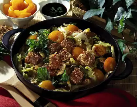 Pour into the hot oil and fry for 1-2 minutes while turning. Remove cheese cubes from the pan. Add shallots to the pan and fry for approx. 4 minutes while turning, add savoy cabbage and fry for another 4 minutes while turning. Deglaze vegetables with apricots and soy sauce, season with salt and pepper and braise for another 4 minutes. Place cheese cubes on the vegetables, dust with paprika and garnish with coriander green