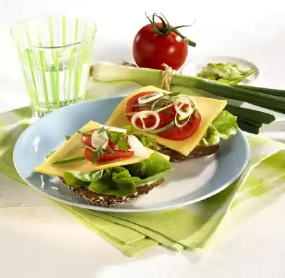 Wash lettuce leaves, spring onion and tomato, dab dry and clean. Cut the tomato into slices and the spring onion into rings. Cut the bread roll open. Spread both halves with lettuce cream and cover with lettuce, cheese, tomato slices and spring onion rings.