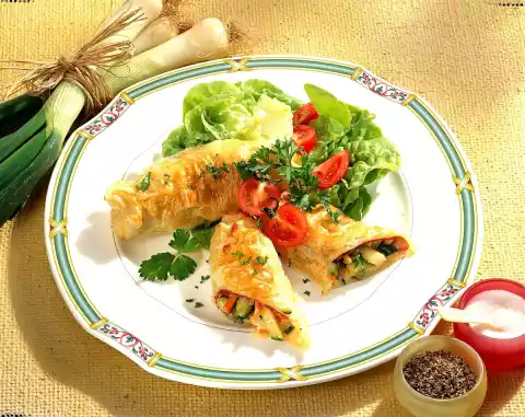 Cover each square with a slice of ham, a slice of cheese and some vegetables. Brush the edges with whisked egg yolk. Roll up and press the ends together. Spread the remaining egg yolk and cream mixture on the rolls. Prick several times with a fork and place on a baking tray lined with baking paper. Bake in the preheated oven (electric: 200 °C/ gas: level 3) for 15-20 minutes. Arrange on plates with some lettuce leaves and tomatoes as desired
