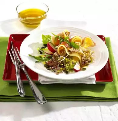 Halve bacon lengthwise. Mix salads, rocket, radishes, sprouts and pumpkin seeds. Mix vinegar, lemon juice, honey, salt and pepper. Stir in olive oil and pumpkin seed oil. Drizzle the vinaigrette over the salad and arrange on plates with bacon and cheese