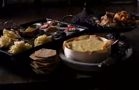 Open at the 4 corners. Bake for another 8-12 minutes at the same temperature. Break the Parmesan and Gouda cheese into fine chunks. Arrange on a plate and sprinkle with vinegar. Arrange cream cheese pralines in paper sleeves, Têter de Monte with fig mustard on a plate.