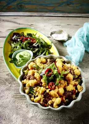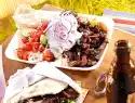 Wash herbs, pluck leaves. Puree with yoghurt. Stir in the quark. Whip cream until stiff, fold in, season. Serve casserole with salad and herb dip.