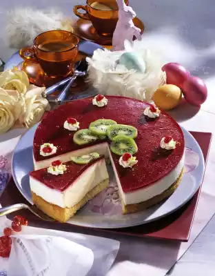 Pass the raspberries through a sieve. Fill up raspberry puree with water to 1/4 l liquid. Mix cake glaze powder and 50 g sugar. Mix with the raspberry mixture in a small pot and bring to the boil while stirring. Let it cool down for about 2 minutes and spread it on the cake from the middle. Chill for about 1 hour. Decorate the cake with cream tuffs, pistachios, sugar eggs and kiwi