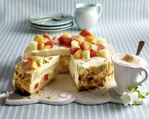 Fold 1/2 of the melon pieces into the cream and spread 2/3 of the cream on the bottom cake layer. Place the 2nd cake base on top and spread the rest of the cream on top. Chill the cake for at least 4 hours. Roast the flaked almonds in a pan without fat. Remove the cake from the tin and press 3/4 of the almond flakes onto the edge. Decorate cake with melon pieces and remaining almonds