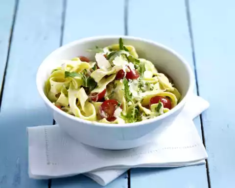 Clean, wash, shake dry and, depending on the size, cut into small pieces if necessary. Finely slice Parmesan cheese. Add basil and tomatoes to the sauce and warm up slowly. Meanwhile prepare pasta in boiling salted water according to the instructions on the packet.
