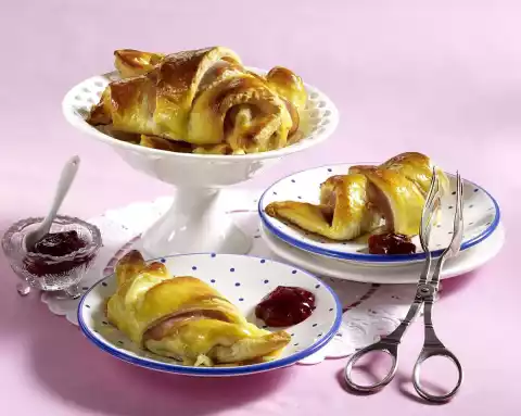 Bake in a preheated oven (electric cooker: 200 °C/ convection oven: 175 °C/ gas: level 3) for approx. 18 minutes. Whisk egg yolk and cream. Brush the croissants with the mixture 2-3 minutes before the end of the baking time. Remove the croissants from the oven, let them cool down a bit and serve them still lukewarm. Cranberries taste great with them
