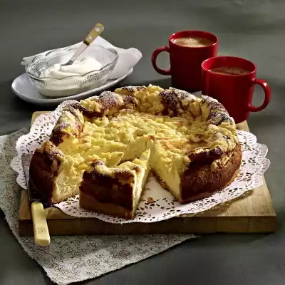 Knead 100 g flour, 75 g sugar, vanillin sugar and 75 g butter into crumbles. Remove the mould from the oven, pour in the quark mixture and sprinkle with crumbles. Bake in the preheated oven (electric cooker: 175 °C/ convection oven: 150 °C/ gas: see manufacturer) for approx. 1 hour, after approx. 40 minutes cover the cake with foil. Remove the cake, let it cool down and dust with icing sugar. Whipped cream tastes good with it