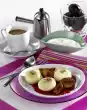 Cut ham rolls into thick slices. Arrange on the salad plates with 2 slices of pumpernickel each. Garnish with remaining dill