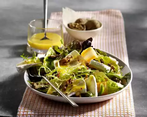 Coarsely chop the nuts and roast them in a pan without fat, take them out. For the vinaigrette, whisk vinegar, salt, pepper, mustard and honey. Add oil drop by drop to the vinaigrette. Peel the shallot, cut into fine cubes and stir into the vinaigrette.