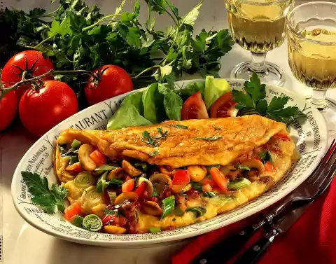 Clean, wash and slice the mushrooms. Clean, wash and slice spring onions. Clean, wash and quarter the tomatoes. Remove seeds from tomato quarters, cut flesh into cubes. Dice bacon and leave it crisp in a pan without fat. Add mushrooms and fry. Add spring onions and tomatoes. Season with salt and pepper. Whisk eggs, some salt and 2 tablespoons of cold water. Stir in cheese sticks. Drain the fat in a large pan. Add egg mixture and let it simmer at low heat. Spread the bacon vegetables over the omelette and let them set completely. Arrange the omelette folded down on a plate with possibly some lettuce, tomato cake and parsley