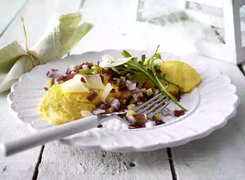 Use a peeler to remove some shavings from the cheese. Grate the rest finely. For the omelette, whisk the eggs. Season with about 1/2 tsp. salt and 1 pinch of pepper. Stir in grated cheese.