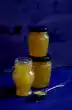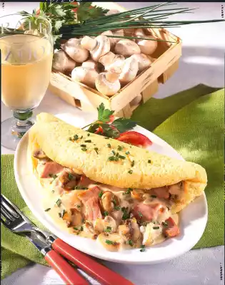 Wash the mushrooms, dab dry and cut into slices. Peel and chop the onion. Heat 1 teaspoon of oil. Fry the mushrooms and onion until golden brown. Cut ham into small pieces and fry briefly. Deglaze with 100 ml water, bring to the boil briefly. Stir in broth and binding agent. Stir in cream. Season with salt and pepper. Arrange the omelette with the ragout. Sprinkle with chives
