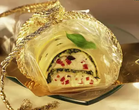 Peel the garlic. Chop basil, pine nuts and garlic finely in the universal chopper. Stir in parmesan and olive oil and season with salt and pepper. Line a long (approx. 50 cm long, 6 cm wide / 1.1 litre capacity) semicircular shape (looks like a rain gutter) with cling film. Then lay out the mould with cheese slices so that the slices hang over the edge of the mould on the right and left. Spread approx. 2/3 of the pesto on the cheese slices and cover with cheese slices. Spread half of the fresh cheese cream on top and cover with a layer of cheese. Spread with the remaining pesto and cover with the remaining cheese. Spread the rest of the cream cheese on top and fold the excess cheese over the filling. Press well, cover with foil and put in a cool place for about 1 hour.