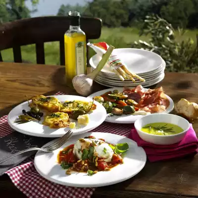 Roast under the preheated grill for about 5 minutes until the cheese and bread begin to brown. Put 1/2 teaspoon of pesto on each bread. Serve immediately. Olives and caper apples are delicious with it