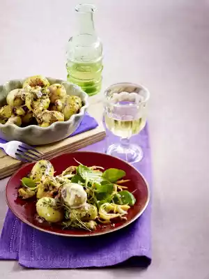 In the meantime, sort out the spinach, wash and shake dry. Add nuts and spinach to the vegetable salad, season again. Arrange potatoes and salad.