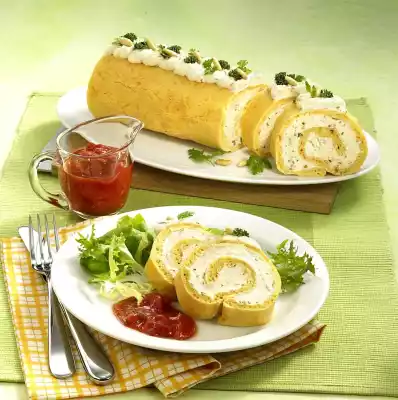 Mix cream cheese and season to taste with salt, pepper, Tabasco and paprika. Roast pine nuts in a pan without fat. Put 10 pine nuts aside for decoration. Roughly chop the remaining pine nuts. Whip the whipped cream until stiff. Stir cream and 40 g Gruyère cheese into the cream cheese. Pour 6 tablespoons of the cream into a piping bag with a perforated spout. Stir herbs and pine nuts into the rest of the cream. Unroll the cooled base, spread the cream evenly on the base and roll up again. Decorate the roll with the remaining cream. Garnish with pine nuts, salad, chervil and parsley leaves. Add tomato salsa