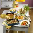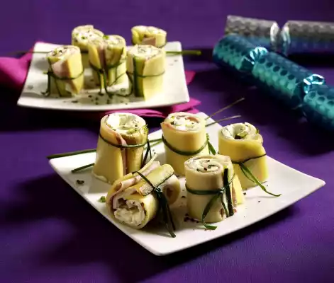 Cut the remaining zucchini into fine cubes. Heat 1 teaspoon of oil in a frying pan. Brown the onion, garlic and zucchini and add to the cream cheese. Season with chilli flakes, salt and pepper. Cover each slice of cheese with 1 ham and 2 zucchini slices.