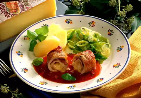 Clean and wash the leek and cut it diagonally into thin slices. Beat the pork escalope a little flat and season with a little salt and pepper. Cut cheese into thin slices and put 2 slices on each cutlet. Put 2 slices of bacon on top and roll up the roulades. Pin them with roulade needles.