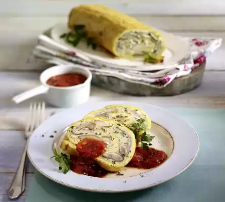 Roll out the roll. Spread mushroom mixture on top and roll up. Bake at the same temperature for about 10 minutes. Cut the roulade into slices. Garnish with parsley. Serve with tomato sauce.