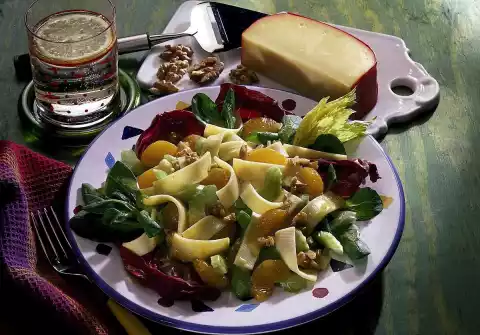 Drain the mandarins on a sieve. Clean, wash and thinly slice the celery. Cut the cheese into thin strips. Mix all ingredients together. Clean, wash and drain lamb's lettuce and radicchio.