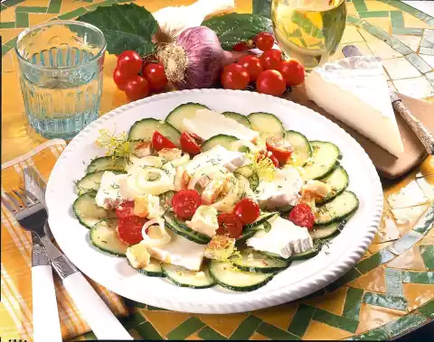 Clean, wash and halve the tomatoes. Wash dill, dab dry and chop. Cut cheese into thicker slices and halve or cut into thirds as desired. Arrange cucumber, tomatoes, onions and cheese on plates, pour vinaigrette over them and sprinkle with bread cubes and dill. Serve garnished with dill flowers as desired
