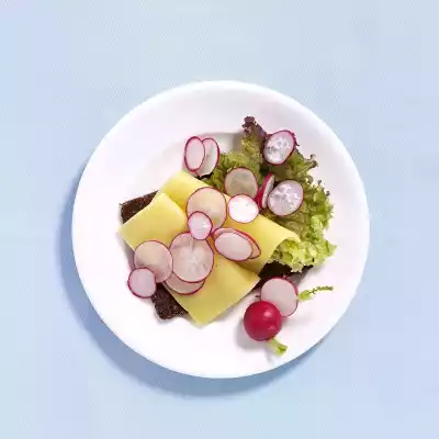 Wash the salad and shake dry. Clean the radishes, wash them. Halve 1 radish, cut the remaining radishes into slices. Cover bread with lettuce leaf and cheese. Spread radishes on top and garnish with halved radish.