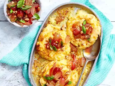 For the salsa, chop the Brazil nuts coarsely and roast them in a pan without fat. Take out, let cool. Wash and quarter the grapes. Wash basil, shake dry, pluck off leaves. Mix everything with vinegar. Season with salt, pepper and sugar.