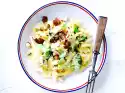 Remove the rind from the brie, dice the inside. Coarsely grate the raclette. Grease six ovenproof dishes (approx. 125 ml each) and dust with flour. Preheat oven (electric cooker: 200 °C/circulating air: not suitable/gas: see manufacturer).