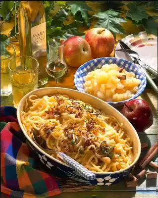 Sprinkle cheese noodles with onion rings and chopped parsley. Add apple compote extra.