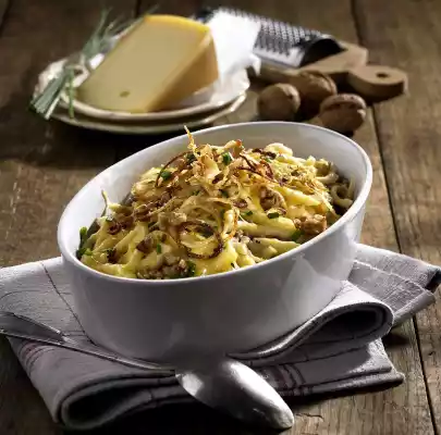 Mix flour, eggs, approx. 1 teaspoon salt, 1 pinch of nutmeg and mineral water to a thick dough. Let it rest for at least 1 hour. Grate cheese. Chop walnuts