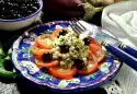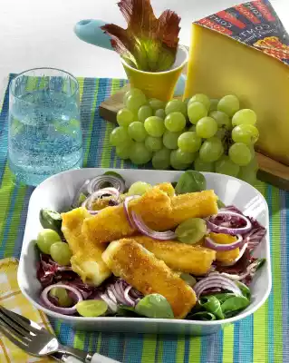 Cut the cheese into 1 cm thick, slightly longer strips. Add flour, egg and breadcrumbs to 1 telelr each. Whisk the egg. Turn the cheese in flour, egg and breadcrumbs one after the other. Wash, halve and core the grapes. Clean and wash lettuce.