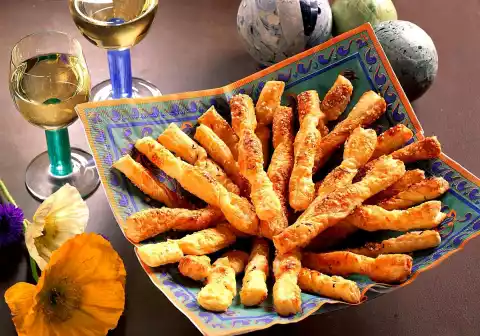 Cut crosswise into strips of approx. 2 cm width and turn them into a spiral. Place the sticks on a baking tray lined with baking paper. Sprinkle with salt, sesame or caraway seeds. Bake in a preheated oven (electric cooker: 200 °C/ gas: level 3) for about 10-15 minutes. Results in about 36 sticks
