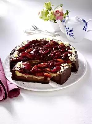 Wash and quarter the plums and remove the stone. Put 100 ml water, port wine, 1 packet vanilla sugar, cake glaze, 1 tablespoon sugar, cloves, cinnamon and star anise in a pot. Bring the port wine mixture to the boil and let it steep for about 10 minutes. Remove spices. Add the plums, bring to the boil and pour onto the cake, leaving about 2 cm free to the edge. Put the cake in a cool place