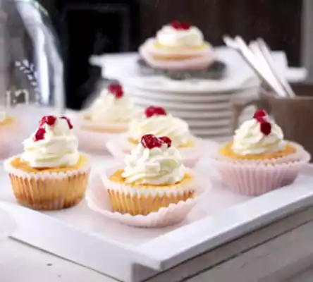 Whip the cream until stiff, while pouring in 1 sachet of vanilla sugar. Pour into a piping bag with a large star-shaped spout. Spray a cream tuff on each tartlet and decorate with cranberries.