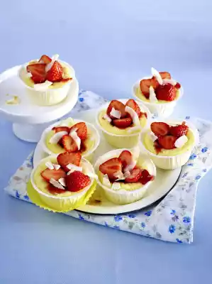 Clean 12 small strawberries, put one strawberry in each mould with the tip pointing upwards. Bake in the preheated oven (electric cooker: 175 °C/ convection oven: 150 °C/ gas: level 2) for 20-25 minutes. Take the muffins out of the oven, let them cool down on a cake rack for about 2 hours