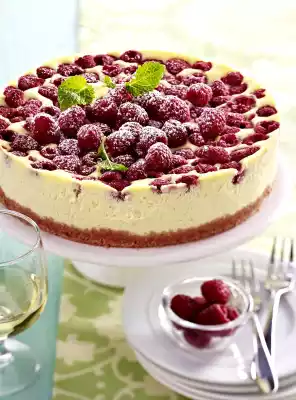 Raspberries selected. Mix cream cheese, vanillin sugar, lemon peel, crème fraiche, sugar and flour. Stir in the eggs one by one. Pour the cream cheese mixture onto the biscuit base and spread 2/3 of the raspberries on the surface, press slightly