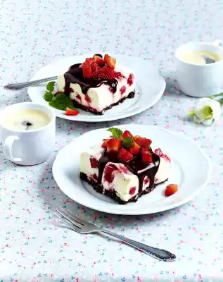 Remove the cake from the mould. Cut into about 16 pieces. Spread approx. 1-2 tbsp. icing on each piece. Add strawberries. Keep cold until serving.