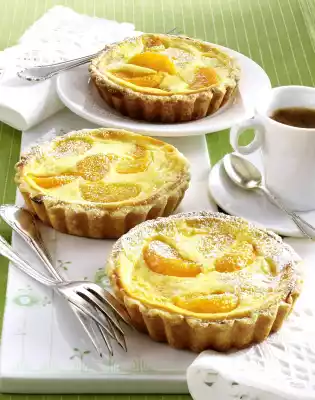 sugar and vanilla sugar until creamy with the whisks of the hand mixer. Add quark, crème fraîche, pudding powder and 2-3 tbsp. mandarin orange juice and stir until smooth. Grease tartlet moulds (10 cm Ø) with lift-off base. Divide the dough into 4 equally sized pieces and roll out into circles (approx. 14 cm Ø) on a floured work surface. Place the dough in the greased moulds, press the edges slightly and prick the bases several times with a fork. Fold the mandarins into the quark mixture. Spread the quark mixture over the ramekins. Bake in the preheated oven (electric range: 175 °C/ convection oven: 150 °C/ gas: level 2) bottom shelf for 35-40 minutes. Remove the tartlets, let them cool down a little and remove them from the tartlets.